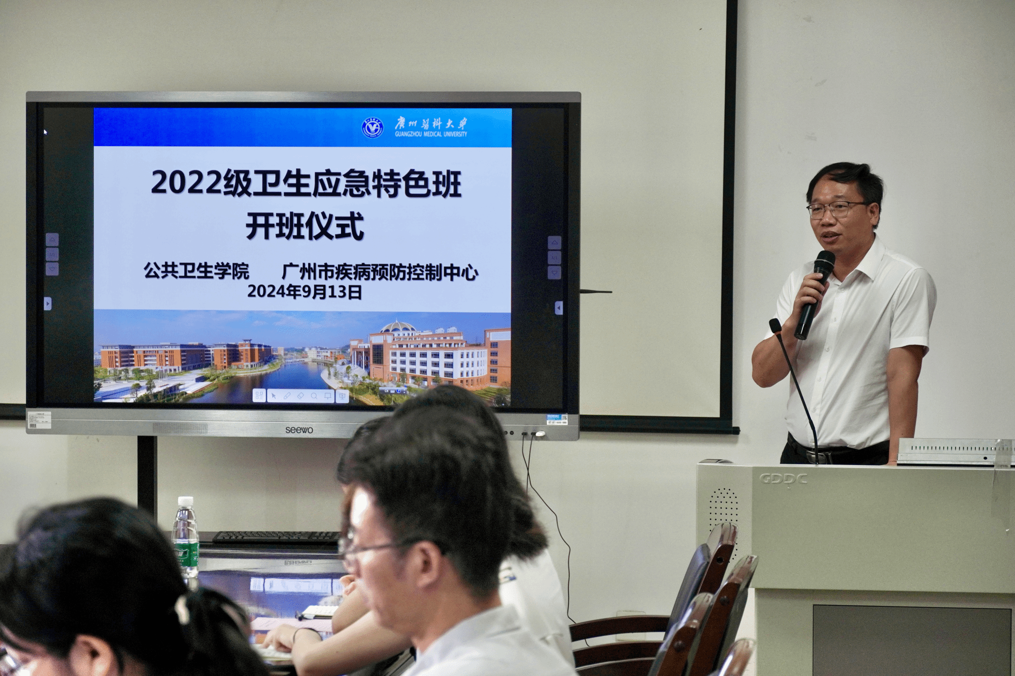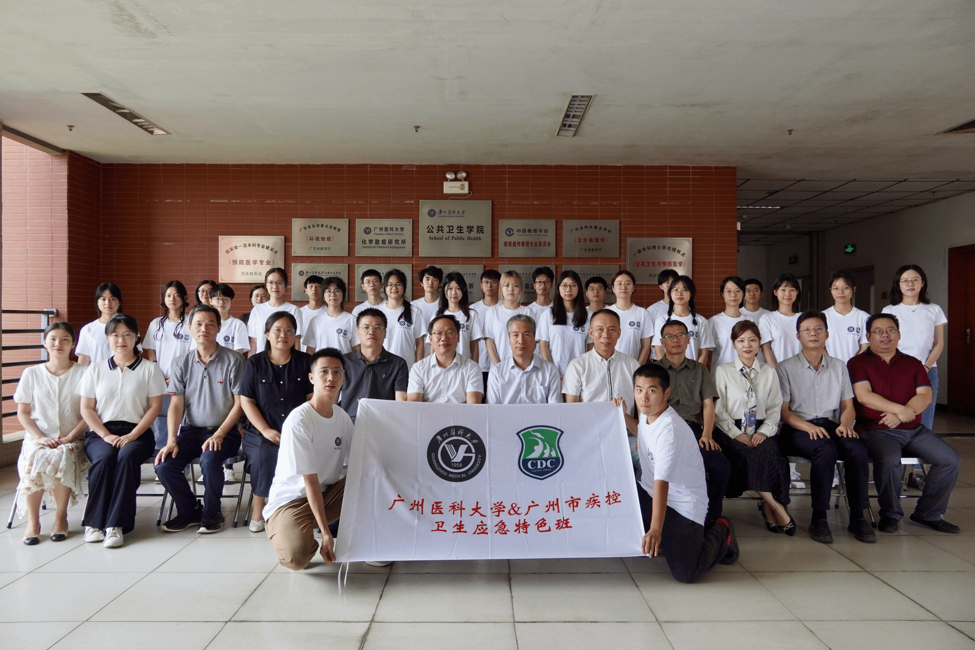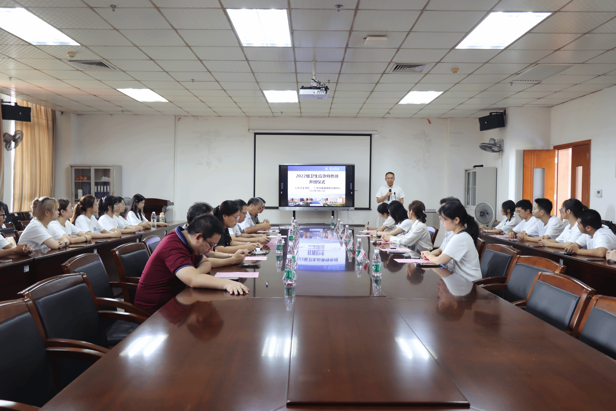 广州医科大学教务处郑建民处长,亚洲色吧 蒋义国院长、李羽书记、杨巧媛副院长,广州市疾控科教信息部侯建荣副部长,亚洲色吧 相关部门负责人、特色班教师代表及卫生应急特色班全体学生参加了此次活动。