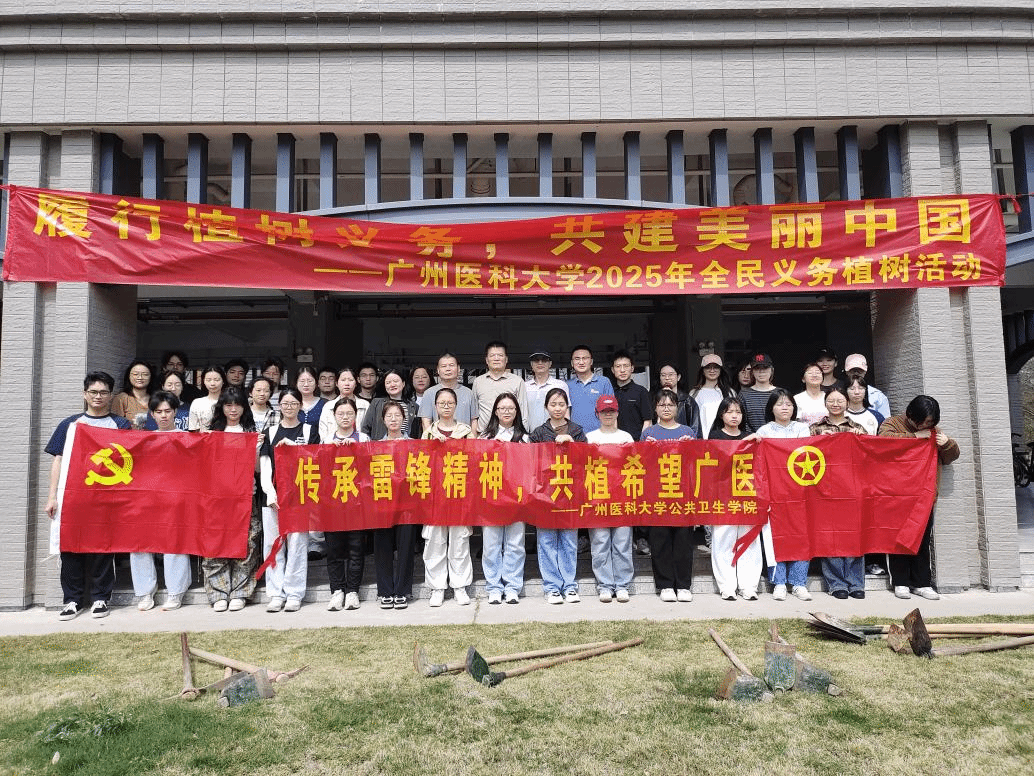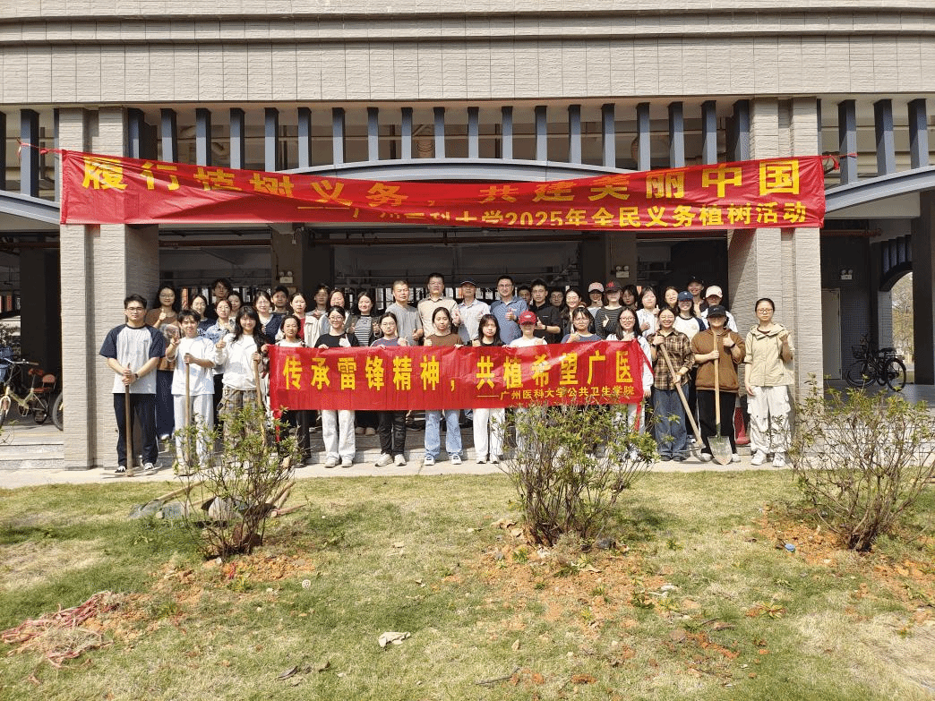 为深入践行习近平生态文明思想,营造爱绿植绿护绿的良好氛围,2025年3月12日,亚洲色吧 党委李羽书记、刘宇珊副书记携学生办全体辅导员、学生第二党支部党员代表和各专业学生代表30余人,于广州医科大学番禺校区开展了“传承雷锋精神,共植绿美广医”主题植树活动。