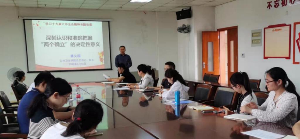 亚洲色吧 党委常委、副校长胡丙杰分别以“总结党的百年奋斗重大成就和历史经验”和“牢记初心使命,坚决拥护两个确立——学习十九届六中全会精神” 为主题,为教工第一支部党员作了两次专题党课。亚洲色吧 总支书记、院长蒋义国为该支部党员分别就“准确领会党的十九届六中全会核心要义”和“深刻认识和准确把握‘两个确立’的决定性意义”为主题,进行了专题党课讲授。总支副书记刘宇珊为教工第二支部党员作了“学习十九届六中全会精神,做好生态文明建设”的专题党课。