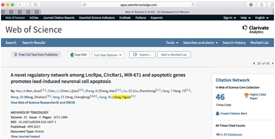 根据ESI最近数据显示,公卫亚洲色吧 蒋义国教授课题组1篇毒理学论文入选高被引论文。该研究论文A novel regulatory network among LncRpa, CircRar1,MiR-671 and apoptotic genes promotes lead-induced neuronal cell apoptosis于2017年发表于著名毒理学杂志Archives of Toxicology,第一作者为博士生南阿若。