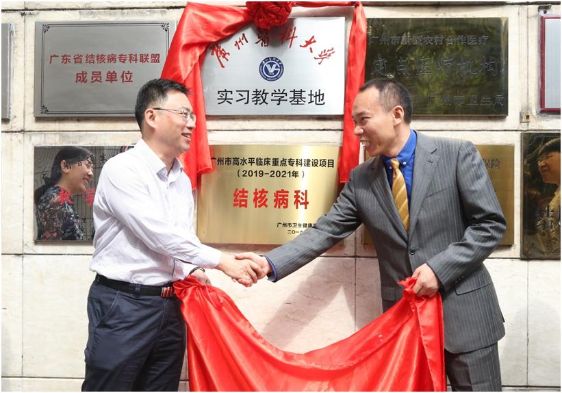 2019年11月12日上午,亚洲色吧 与广州市胸科医院在胸科医院举行了预防医学系“实习教学基地”揭牌仪式。广州市卫健委科教处刘华玲处长,亚洲色吧 蒋义国院长、杨巧媛副院长、学生办何少群主任与预防医学系及院教学办教师一行5人,以及胸科医院刘建雄院长、张言斌副书记、李铁刚副院长、李昕洁副院长及相关科室负责人出席了揭牌仪式。