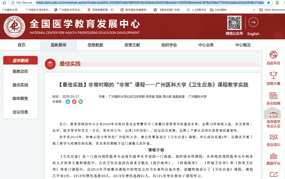 近日,公卫亚洲色吧 实践教学经验总结文章“非常时期的‘非常’课程——广州医科大学《卫生应急》课程教学实践”,在全国医学教育发展中心网站医教要闻的“最佳实践”栏目登载,并在其官微公众号推出,产生了广泛影响。