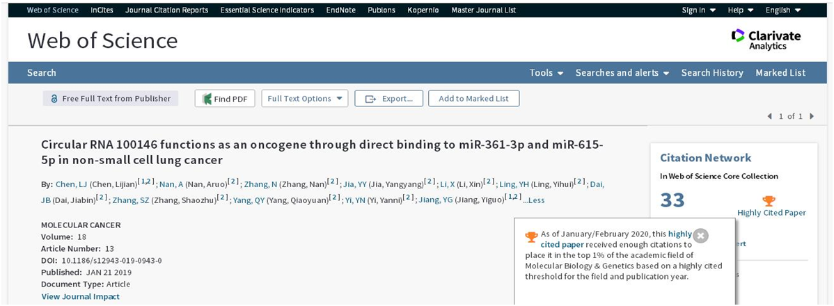 根据国际最新公布的ESI数据显示,我校公卫亚洲色吧 2篇研究论文入选ESI高被引论文。一篇是“Circular RNA 100146 functions as an oncogene through direct binding to miR-361-3p and miR-615-5p in non-small cell lung cancer”,该文2019年发表于一区杂志Molecular Cancer(IF10.6),第一作者为硕士生陈丽剑,通讯作者为蒋义国教授。论文报道了环状RNA 100146在环境致癌物苯并芘诱导肺细胞恶变中具有重要作用。