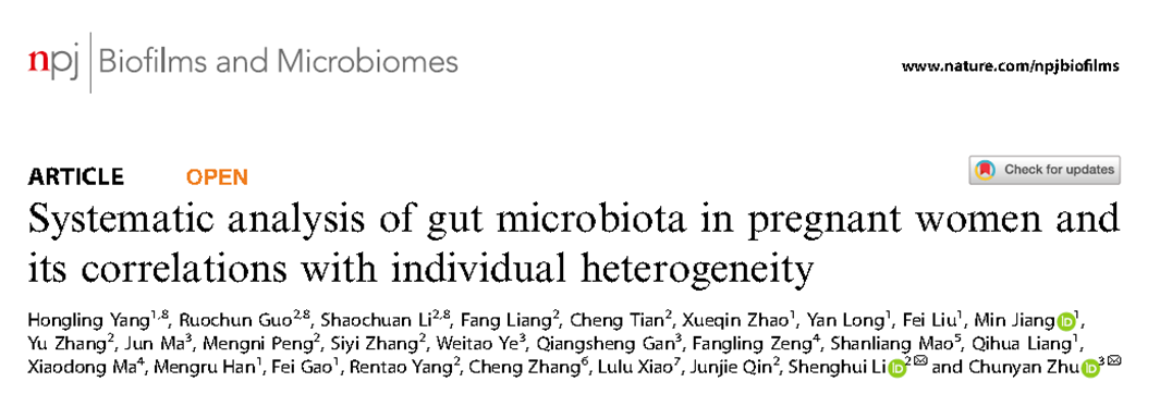 2020年9月11日,微生物学领域国际著名期刊npj Biofilms and Microbiomes(影响因子7)以论著形式,在线发表了亚洲色吧 流行病与统计学系朱春燕教授的科研论文“Systematic analysis of gut microbiota in pregnant women and its correlations with individual heterogeneity”。我校附属妇儿中心的杨红玲、深圳谱元研究所的郭若纯和李少川为本文共同第一作者,朱春燕教授和深圳谱元研究所的李胜辉为共同通讯作者。
