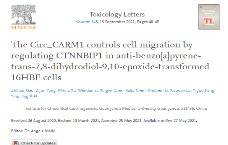 近日,国际毒理学主流期刊Toxicology Letters在线发表了亚洲色吧 在读本科生萧志昊等人的研究论文“Thecirc_CARM1 controls cell migration by regulating CTNNBIP1 in anti-benzo[a]pyrene-trans-7,8-dihydrodiol-9,10-epoxide-transformed 16HBE cells”。该研究以苯并芘代谢致癌物anti-BPDE诱导恶性转化的人气道上皮细胞模型,分析鉴定了环状RNA分子circ_CARM1在恶性细胞中的功能及作用机制。研究发现circ_CARM1通过与微小RNA miR-1288-3p相互作用,调节CTNNBIP1(β-catenin相互作用蛋白1)的表达,影响转化细胞的恶性特征。该研究为进一步阐明外源化学物致癌的表观遗传学机制提供了依据。