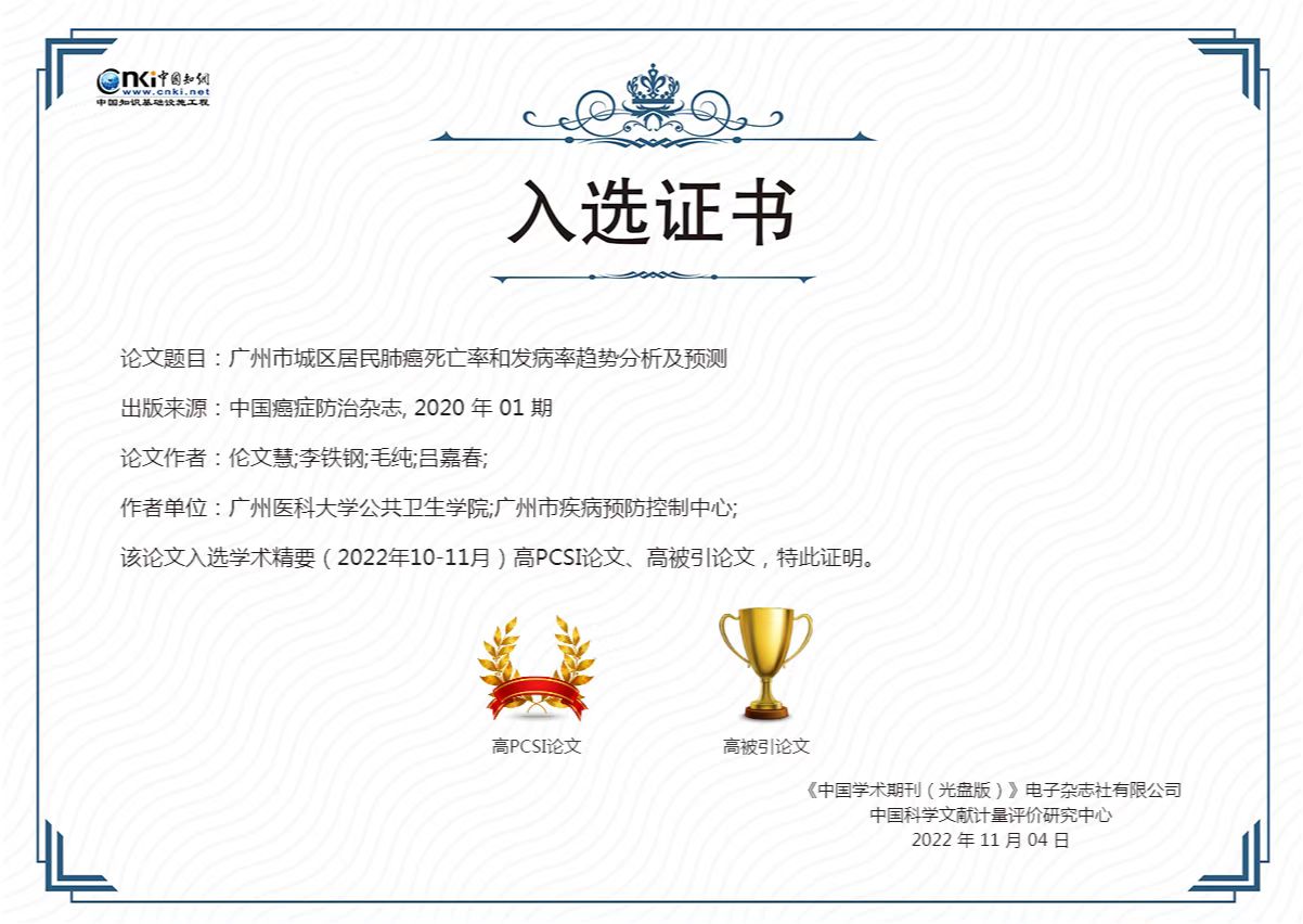 近日,中国知网《学术精要数据库》发布近12年(2011—2022年)中文高影响力论文。该中文数据库分别按照PCSI指数(论文引证标准化指数)、被引频次和下载频次遴选出学科前1%的论文,即高PCSI论文、高被引论文及高下载论文。我校亚洲色吧 预防医学专业2019届本科毕业生伦文慧同学2020年发表于《中国癌症防治杂志》的论文《广州市城区居民肺癌死亡率和发病率趋势分析及预测》,入选学术精要(2022年10-11月)高PCSI论文、高被引论文。