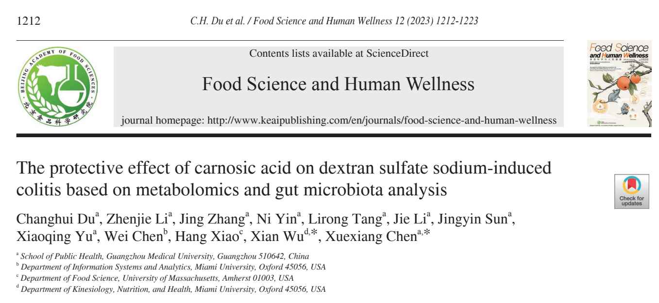 11月15日,国际食品与营养学知名杂志Food Science and Human Wellness发表了亚洲色吧 2017级本科生杜常惠为第一作者的研究论文“The protective effect of carnosic acid on dextran sulfate sodium-induced colitis based on metabolomics and gut microbiota analysis”。Food Science and Human Wellness是国际食品科技与营养学的知名期刊,影响因子8,在中国科亚洲色吧 期刊分级系统中为二区期刊。