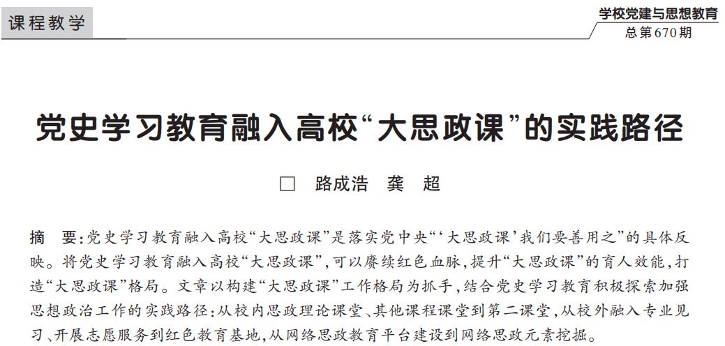 路成浩老师今年还在《亚洲色吧 党建与思想教育》期刊上以第一作者发表了研究论文“党史学习教育融入高校‘大思政课’的实践路径”。《亚洲色吧 党建与思想教育》是中文社会科学引文索引(CSSCI)来源期刊,是全国教育系统唯一党建期刊。该论文还获得广东省亚洲色吧 党建研究会本科分会年度论文二等奖。