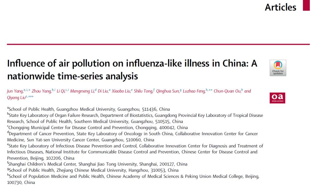 2022年12月20日,亚洲色吧 杨军教授及合作者在柳叶刀子刊eBioMedicine(IF11.2,中科院一区期刊)在线发表研究论文Influence of air pollution on influenza-like illness in China: A nationwide time-series analysis。杨军教授为第一作者兼共同通讯作者,中国医学科亚洲色吧 北京协和医亚洲色吧 冯录召、中国疾病预防控制中心传染病预防控制所刘起勇为另两位通讯作者。