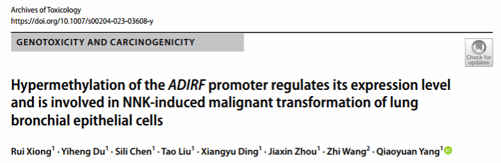 2023年10月1日,亚洲色吧 杨巧媛教授课题组研究论文“Hypermethylation of the ADIRF promoter regulates its expression level and is involved in NNKinduced malignant transformation of lung bronchial epithelial cells” 在线发表,本研究揭示了ADIRF基因启动子区5mC甲基化修饰促进ADIRF mRNA和蛋白表达,参与烟草致癌物4-(甲基亚硝基氨基)-1-(3-吡啶基)-1-丁酮(NNK)致肺上皮细胞恶性转化,是课题组NNK致肺癌表遗传学机制系列研究的深入探索。本研究成果发表于国际毒理学权威杂志Archives of Toxicology。
