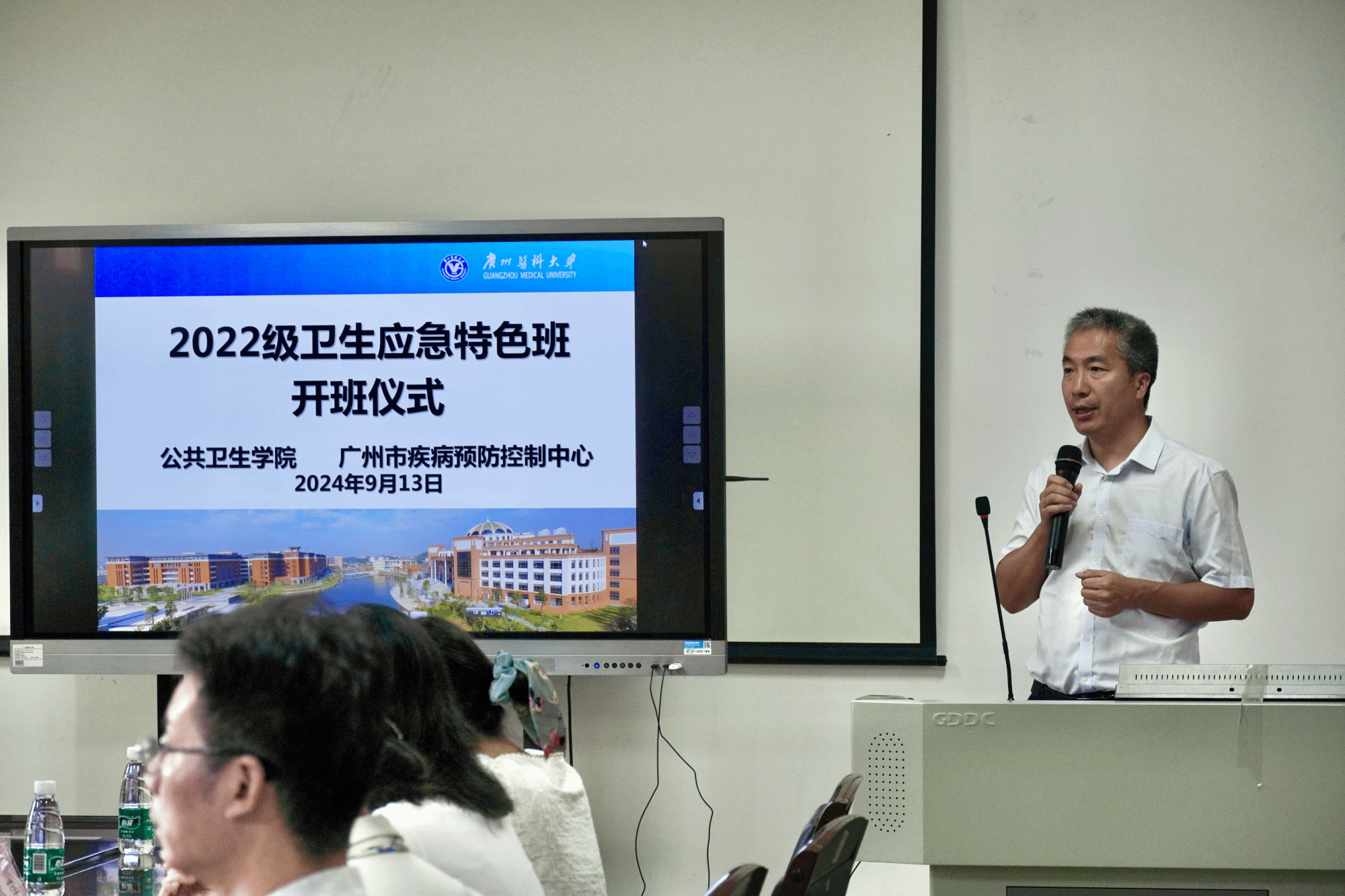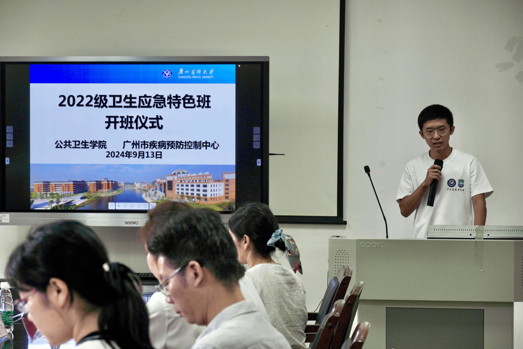 广州医科大学教务处郑建民处长,亚洲色吧 蒋义国院长、李羽书记、杨巧媛副院长,广州市疾控科教信息部侯建荣副部长,亚洲色吧 相关部门负责人、特色班教师代表及卫生应急特色班全体学生参加了此次活动。