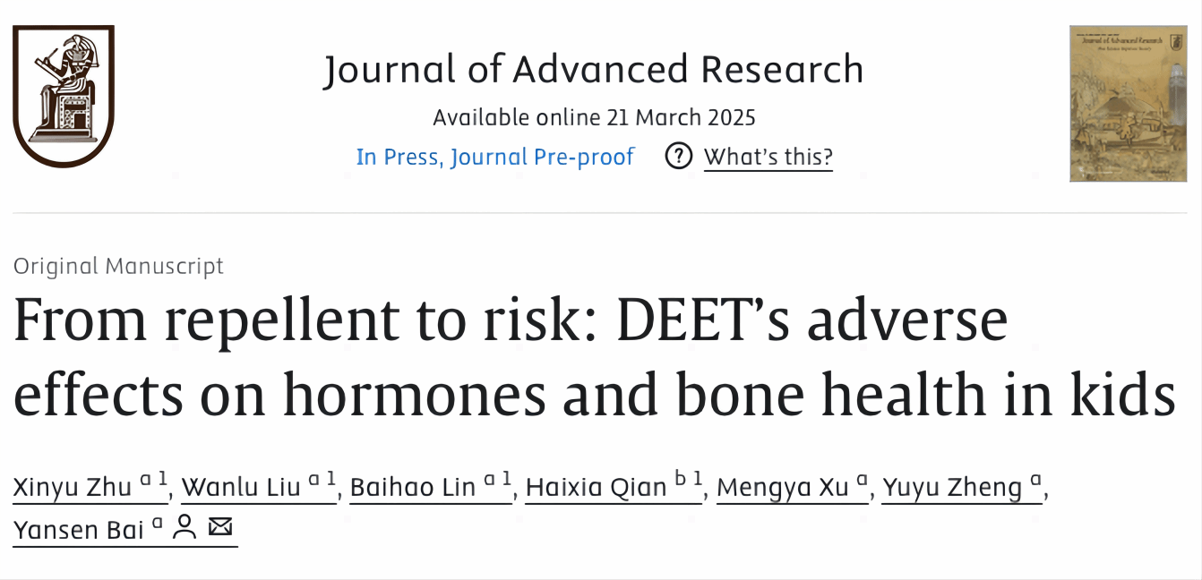 2025年3月21日,公卫亚洲色吧 白岩森教授团队在《Journal of Advanced Research》在线发表了题为“From repellent to risk: DEET's adverse effects on hormones and bone health in kids”的研究论文,揭示了驱蚊剂成分避蚊胺(DEET)高暴露可能通过干扰性激素水平,影响儿童与青少年的骨质累积。公卫亚洲色吧 硕士研究生朱心雨、林柏豪及博士后刘婉露为该论文共同第一作者,白岩森教授为论文唯一通讯作者。