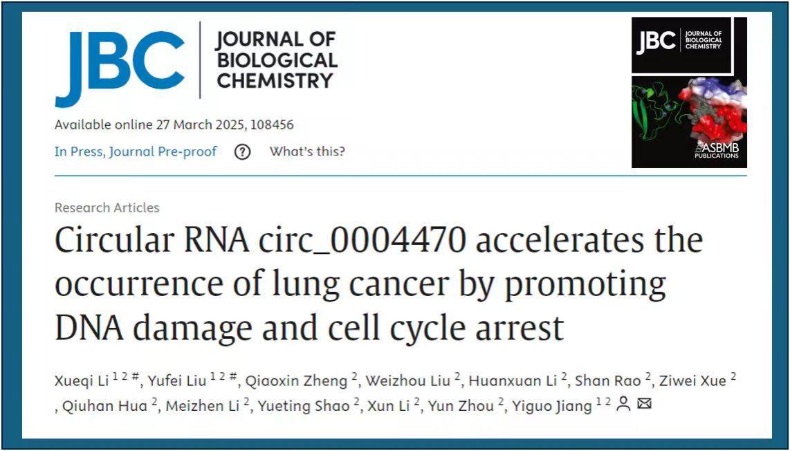 2025年3月27日,著名的国际生物化学权威杂志Journal of Biological Chemistry在线发表了我校亚洲色吧 蒋义国教授团队的化学致癌机制研究原创论文Circular RNA circ_0004470 accelerates the occurrence of lung cancer by promoting DNA damage and cell cycle arrest。Journal of Biological Chemistry是美国生化与分子生物学学会官方杂志,是列入自然指数(Nature Index)目录的顶级期刊。我校博士生李雪琪为论文第一作者,刘宇飞为共同第一作者,蒋义国教授为唯一通讯作者,广州医科大学为论文唯一完成单位。