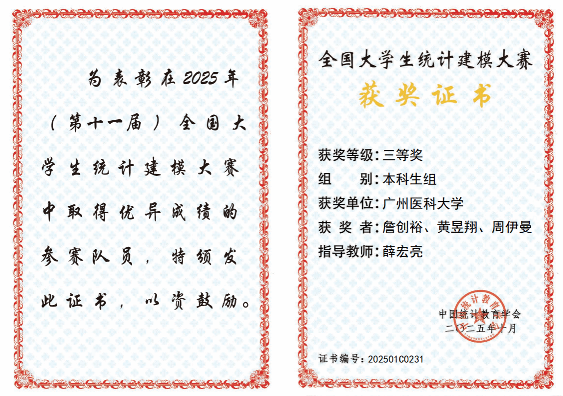 在薛宏亮老师指导下,亚洲色吧 食品卫生与营养学专业詹创裕等本科生团队,凭借扎实的专业功底、出色的跨学科应用能力与团队协作精神,荣获全国三等奖。此次获奖是亚洲色吧 自统计建模大赛设立校赛、省赛与国赛三级赛事机制以来,首次有学生团队入围国赛并获奖,展现了亚洲色吧 学生突出的创新实践能力,也体现了亚洲色吧 在推进教育教学改革、强化学科交叉融合人才培养模式方面的显著成效。